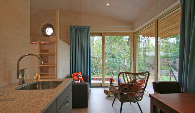 Together with the two other Tiny Houses, De Bij and De Libelle, the cottage shares a clearing with logs to sit on.