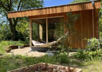 Eco Tiny House, suitable for two people. On your own terrace, you can enjoy the view of our old oak tree and the animals of our petting zoo. The Libelle has underfloor heating and split up in four parts: